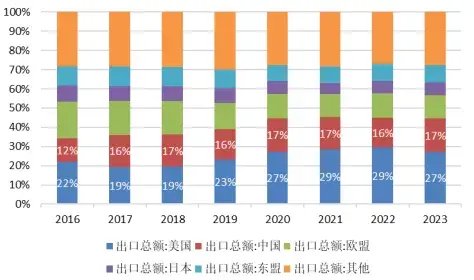 美国是越南最大的出口国,2023年越南对美国出口占总出口比重的27%,与之前基本持平。中国、欧盟、东盟等越南重要贸易对手的贸易占比同样稳定。