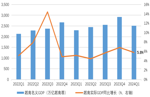 越南经济稳步增长:2024年1季度,越南实际GDP同比增长5.8%,连续保持较高增速。