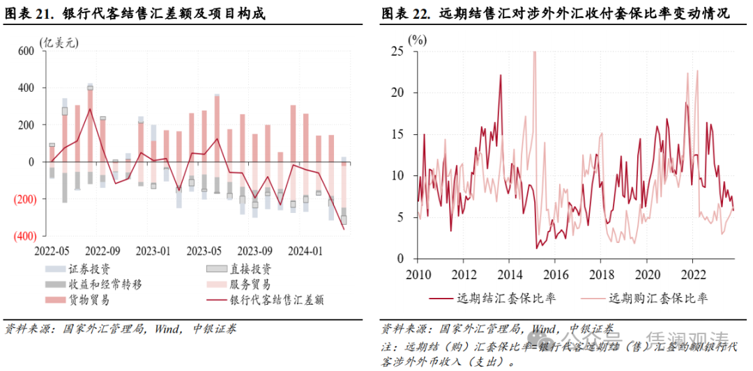 4月份,货物贸易结售汇由上月顺差144亿美元转为逆差23亿美元,为2022年11月份以来首次逆差,贡献了银行代客结售汇逆差环比增加额的70%,为第一大贡献项(见图表21)。同期,货物贸易收付款顺差为245亿美元,环比仅减少31亿美元。两项数据出现明显背离,同样反映了外贸企业结售汇意愿变化。当月,货物贸易结汇占涉外收入比重环比回落2.4个百分点,而货物贸易售汇占涉外支出比重则上升3.3个百分点。