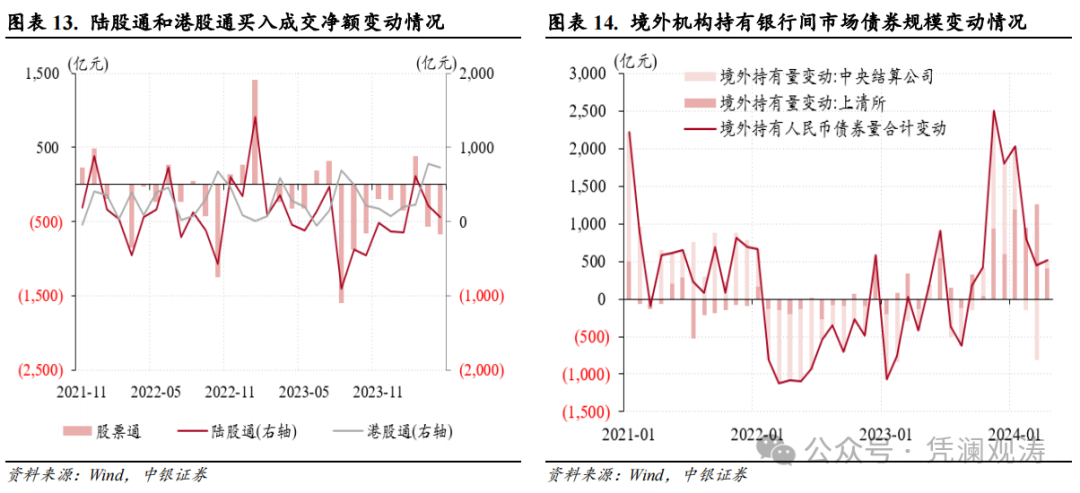 当月,陆股通(北上)资金净流入规模继续收窄,由2月份的607亿先后降至3、4月份的220亿和60亿元,而由于港股上涨势头强劲,港股通(南下)资金净流入规模仅由上月786亿小幅降至735亿元,港股通与陆股通累计净买入成交额轧差后,股票通项下资金净流出规模由上月566亿扩大至675亿元(见图表13)。
