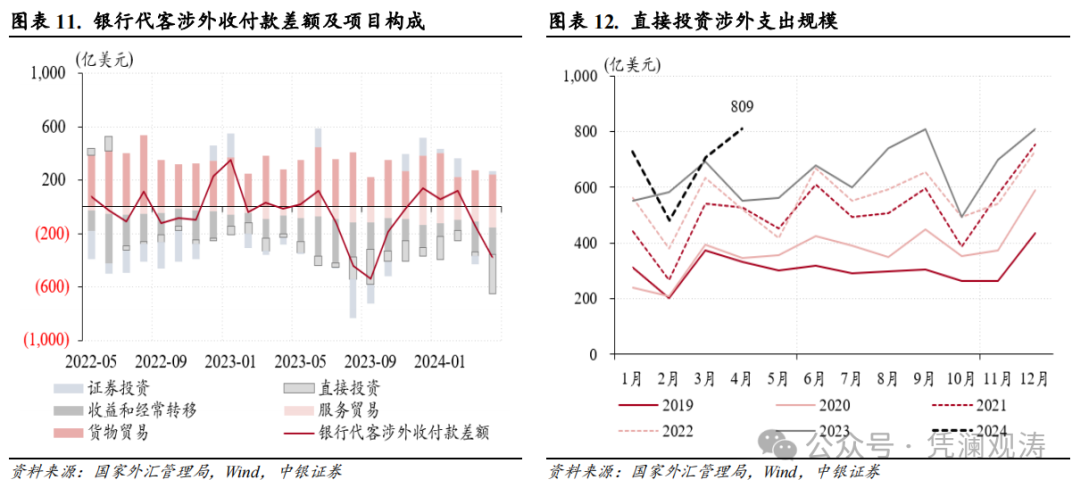 4月份,证券投资涉外收入环比增加85亿美元,大于涉外支出增幅38亿美元,带动证券投资涉外收付款由上月逆差63亿美元转为顺差24亿美元,对银行代客涉外收付款逆差增加为负贡献36%(见图表11)。