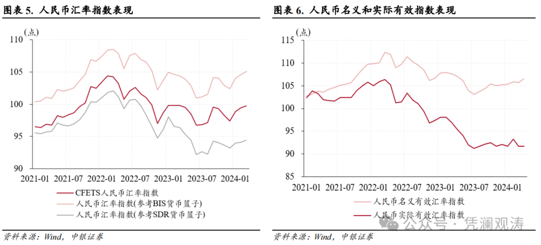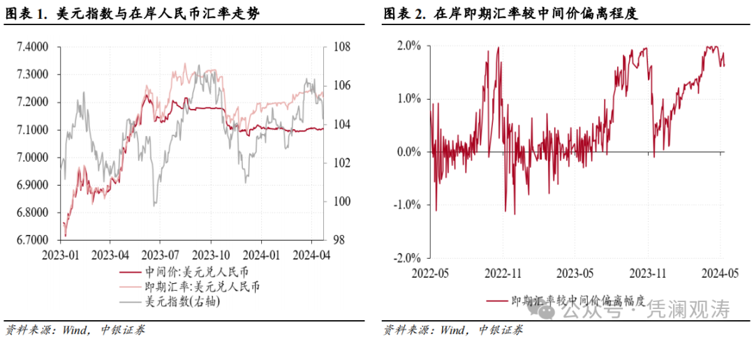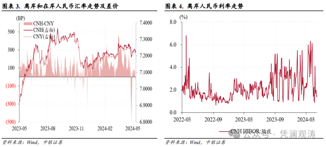 进入5月份以来,包括人民币在内的亚洲货币贬值压力有所缓解。5月1日FOMC会议新闻发布会上,鲍威尔表示,“通胀数据高于预期,意味着我们可能要更久才能对降息有信心,比预想的更久”“我对今年是否会降息没有太大的信心”,不过同时也排除了下次会议加息的可能性。加之4月份新增非农就业数据大幅回落,市场对美联储降息预期再度升温,美元指数明显回调。截至5月17日,日元汇率升破156,较上月底累计升值1.36%;人民币汇率中间价微涨0.03%,即期汇率升值0.24%,即期汇率较当日中间价日均偏离程度收窄至1.7%,CNH相对CNY转为偏升值方向,日均偏离-31个基点。