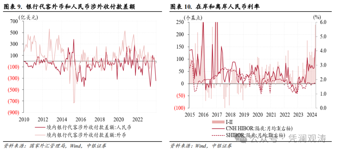 4月份,银行代客涉外收付款延续逆差,逆差规模由上月145亿增至382亿美元,位列历史第九位。分币种看,外币和人民币收付款均为逆差,不过外币逆差仅由上月32亿增至36亿美元,而由于人民币涉外收入减少、支出增加,人民币收付款逆差由上月112亿增至346亿美元,处于历史第五位(见图表9)。根据外汇局解释,跨境人民币净流出增多,主要体现了人民币融资成本相对较低的影响【1】。当月,隔夜CNH HIBOR利率较SHIBOR利率日均偏离程度扩大至+240个基点,环比扩大了133个基点,创2017年2月份以来新高(见图表10)。