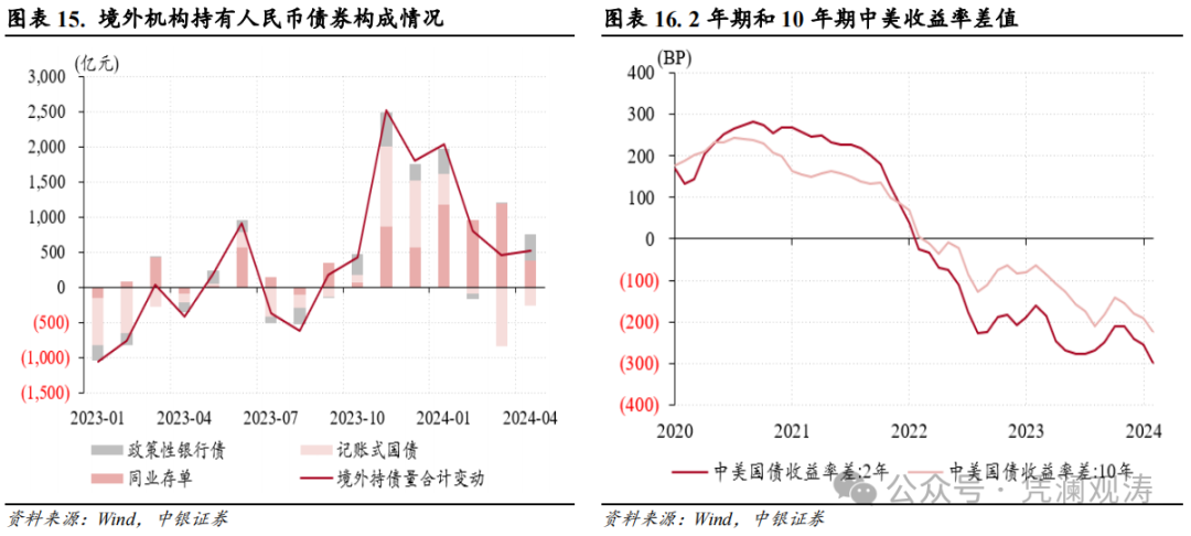 当月,境外机构持有银行间市场债券余额连续8个月增加,净增持规模由上月450亿增至513亿元(见图表14)。分券种看,4月份同业存单收益率均值环比回落13.5个基点,大于同期限国债和国开债收益率降幅7.6、2.4个基点,境外机构放缓增持同业存单,净增持规模由上月1188亿降至374亿元,但加大增持政策性银行债力度,净增持规模由上月5亿扩大至378亿元;在中美利差倒挂程度进一步加深背景下,境外机构继续减持国债,但减持规模由833亿降至270亿元(见图表15、16)。