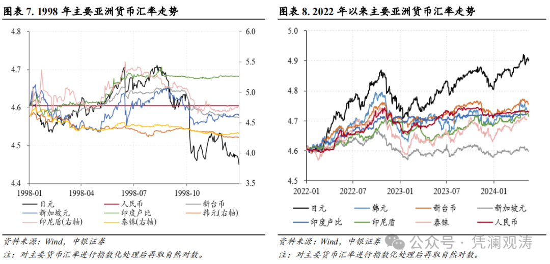 值得指出的是,尽管日元连年大幅下挫,但与亚洲金融危机时期不同,其他主要货币跌幅明显小于日元(见图表7、8)。这主要是因为亚洲金融危机爆发以后,随着日本与中国在亚洲地区的经济和金融影响力此消彼长,越来越多的亚洲货币锚定人民币而非日元。因此,当前人民币汇率维稳政策像二十多年前一样,在亚洲地区扮演了“稳定器”角色,避免了竞争性贬值和信心危机传染。
