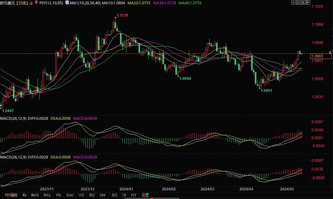 欧元兑美元日线图北京时间5月17日14:21,欧元兑美元报1.0866/67