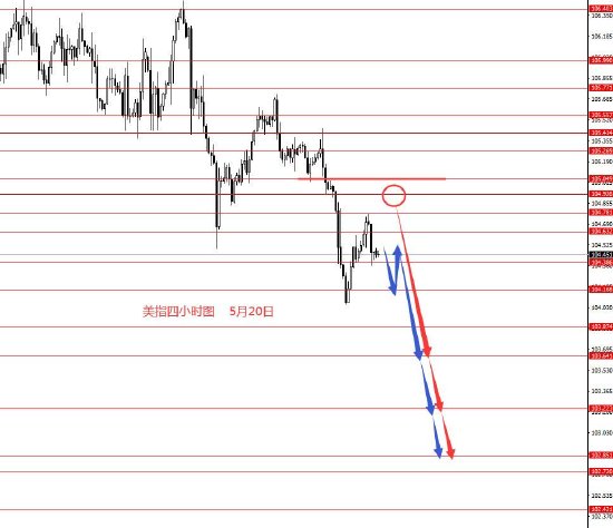 5月20日,美指上周正如预期向下运行,周图收阴柱。从图形来看,本周105.10以下继续看空美指,中线看空。操作建议:104.90附近做空,止损105.50,目标看向103.60和103.20,再看向102.80和101.70区域。短线不建议做多,逢高做空即可,也有可能周初不反弹直接下行。控制仓量,严格止损。