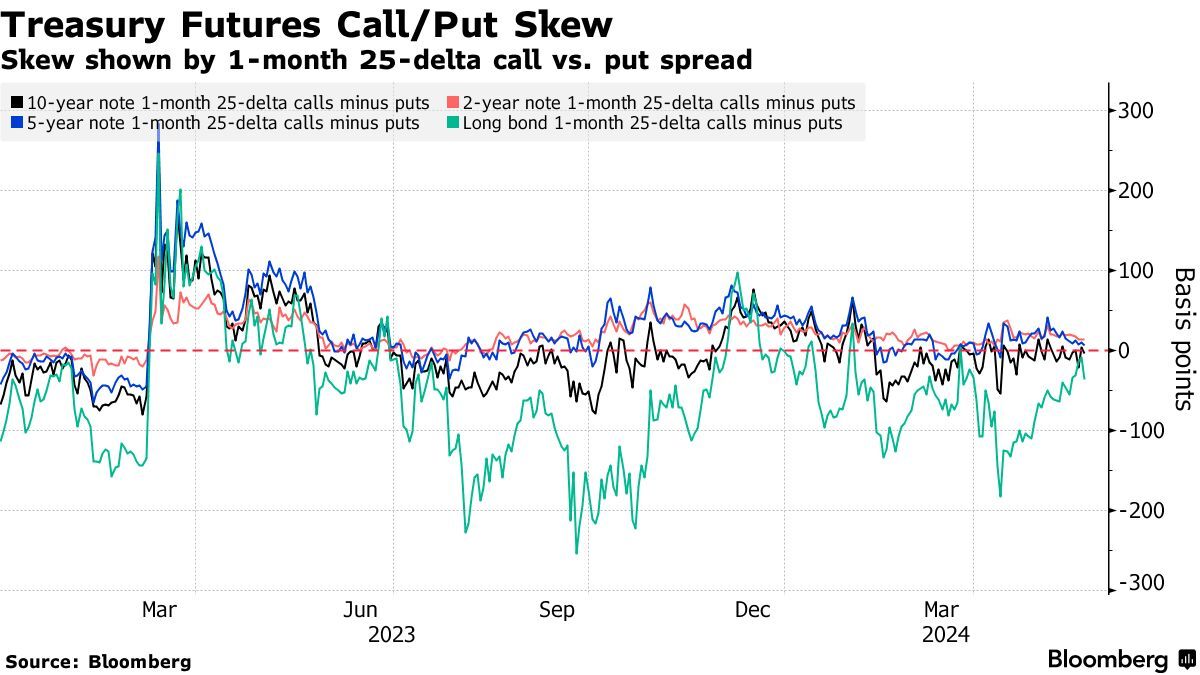 近期,不确定性给美国利率市场带来了一个复杂的背景,市场对当前水平的收益率近期走势的偏见大致保持平衡。这也推动了期权市场上做空波动性押注的流行。做空波动性押注是一种投资策略,如果市场保持平静,就能获得回报。另外,通过期权市场对冲美债走势的成本大致为中性,因近期对冲长期美债抛售的溢价在近几周有所收窄。