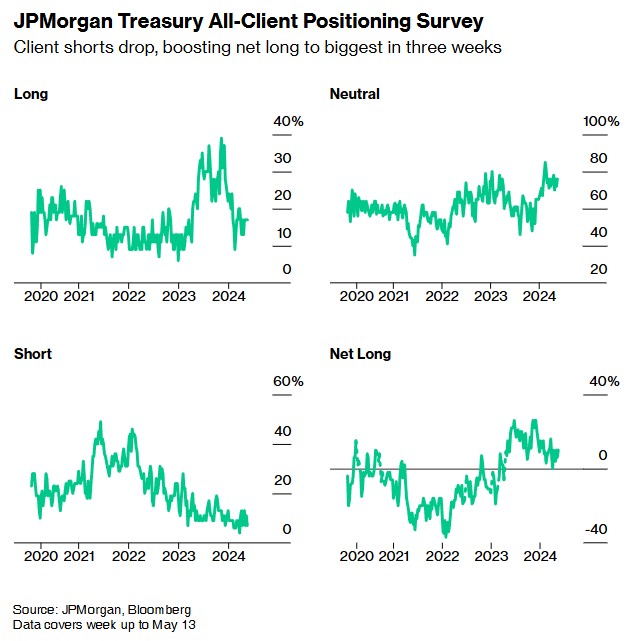 上周,在10年期美债收益率跌至4.3%之际,对冲需求有所增加,本周这一头寸似乎再次增加。与此同时,在现货市场,摩根大通对美债客户的最新调查显示出更为看涨的基调,净多头仓位回升至几周来最大,空头仓位转为中性。数据显示,在截至5月20日的一周内,摩根大通客户削减了4个百分点的空头头寸,转为中性,而多头头寸保持在17%不变;所有客户的净多头头寸现已回到5月6日以来的最高水平。对冲基金则继续站在另外一边,对10年期美债期货的净空头头寸增加约14.5万份,达到近700万份。