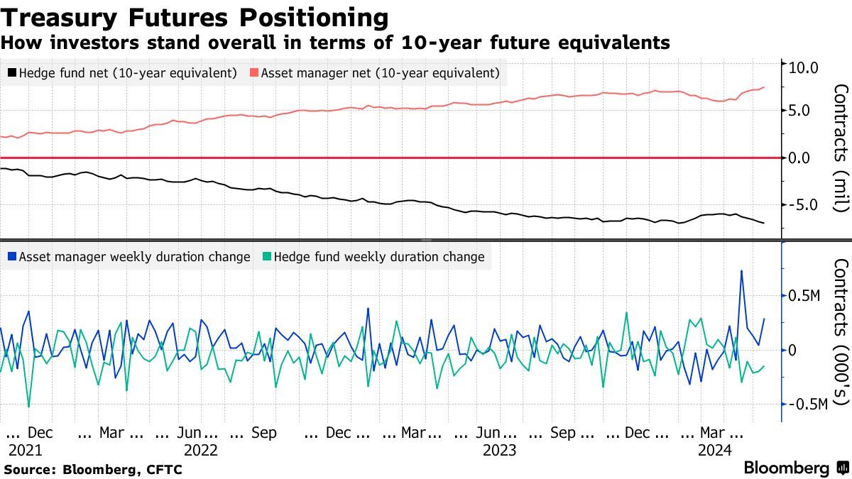 仓位状况表明,随着近几日债券收益率走高,新的空头押注已经重新建立。与此同时,对美国国债的多头头寸已部分出清。交易员们保持谨慎,等待更多数据证实通胀正朝着正确的方向发展,同时等待联邦公开市场委员会(FOMC)周三将公布的5月会议纪要提供有关美联储政策路径的新线索。