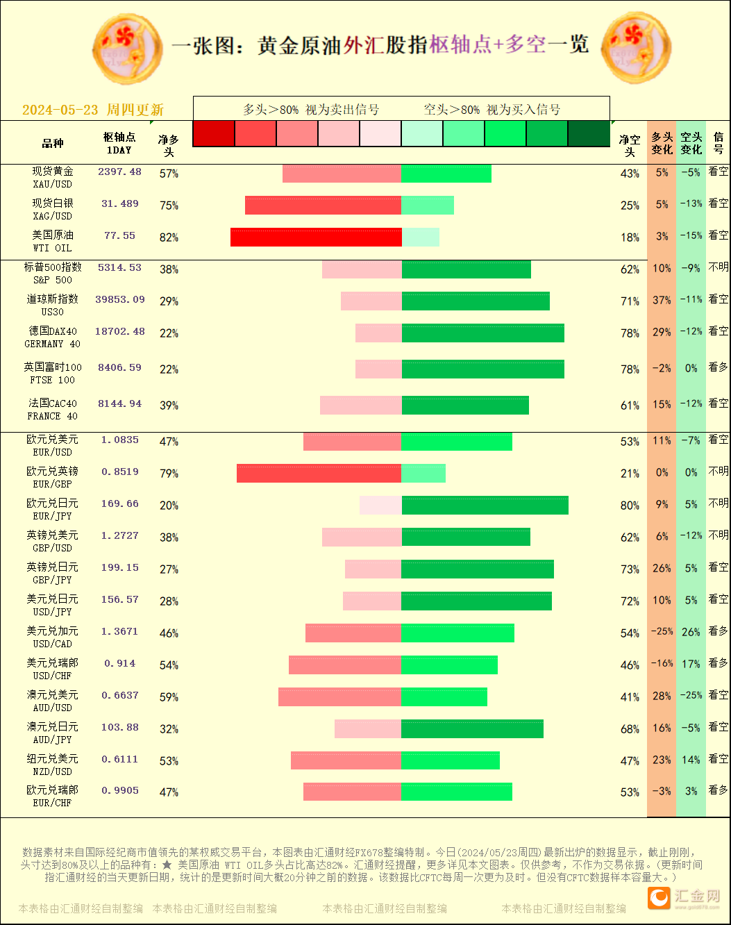一张图:2024/05/23黄金原油外汇股指"枢纽点+多空占比"一览
