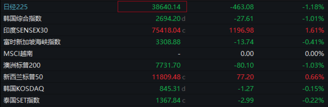 日经225指数跌超1%,韩国综合指数跌1%,澳洲标普200指数跌1%。菲律宾股指下跌1%,至6591.44点。