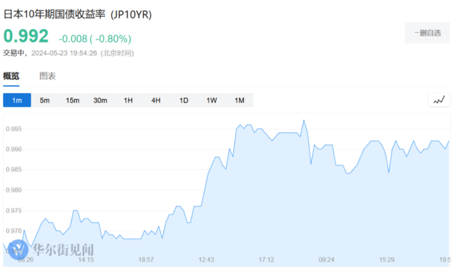 日本10年期国债收益率早盘小幅上涨,目前报0.992%,下跌0.8BP。由于投资者继续权衡日本央行今年是否有能力进一步加息,日本核心通胀率连续第二个月放缓。10 年期日本国债收益率本周一度突破了 1%,因为市场几乎完全预期日本央行将在 7 月份的会议上加息 10 个基点。
