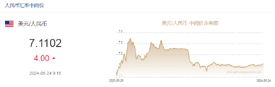 5月24日,人民币中间价报7.1102,下调4点,上一交易日中间价报7.1098。