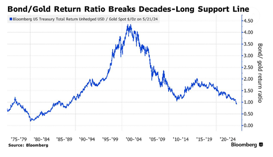 美债/黄金投资回报率跌破数十年支撑线