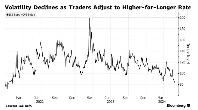 随着美联储始终按兵不动,并耐心等待高利率最终推动经济放缓,债券市场正趋于平稳。美银编制的债市波动率指标MOVE指数,目前已降至了2022年2月以来的最低点。