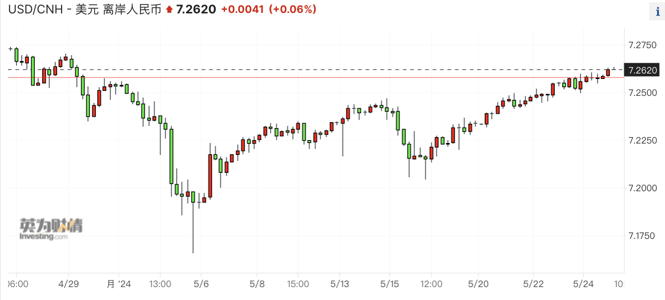 值得一提的是,5月24日,人民币中间价跌穿7.11,创逾4个月新低。此前第一财经就报道,由于人民币开始成为低息货币,近年来人民币和日元的联动明显提升,近期美元强势卷土重来,离岸人民币再度跌至7.26附近。未来除了要关注美联储政策,日元走势也或将给人民币的走势给出线索。