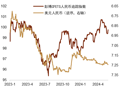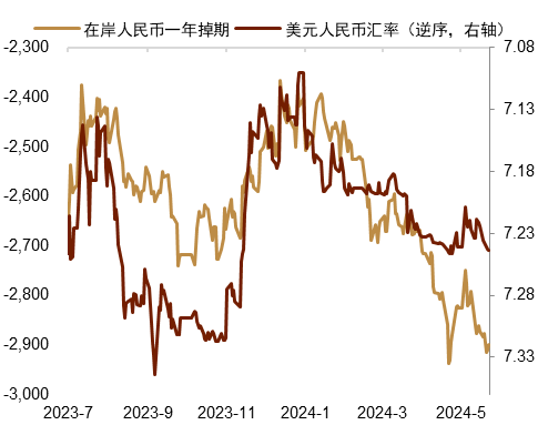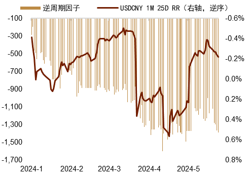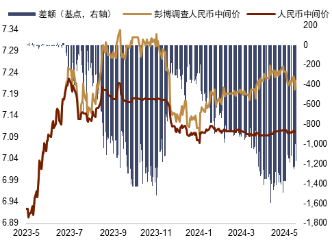 近期随着4月美国就业及通胀数据的降温,以及国内稳地产等政策颁出,外汇市场情绪边际上有所好转。然而中美利差较深倒挂的宏观背景尚未发生根本改变。上周来看,一方面,美国5月Markit PMI及美联储会议纪要将市场降息预期再度推后,美国去通胀最后一公里的颠簸程度超乎预期。另一方面,考虑到国内稳地产政策的落地执行情况还有待观察,市场情绪修复力度有限。我们认为“逆周期因子”将继续依据市场情绪做出调整。例如,上周中间价根据美元升值及人民币汇率贬值而上调,“逆周期因子”亦随着市场贬值预期的增加而悄然发力(图表6)。