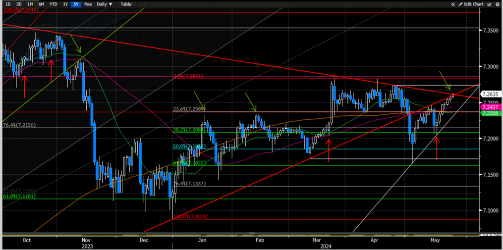 美元/人民币上周突破50天均线之后一路走高至去年4季度以来的下降趋势线阻力附近(图17中绿色箭头)。向前看,如果美元多头无法成功突破这一关键阻力位置,那么美元回落的概率依旧存在,21天均线7.2350附近可能成为近期下方支撑(图17中绿色线)。而如果美元多头可以突破去年4季度以来的下降趋势线阻力(图17中绿色箭头),那么年内高点7.28附近可能会成为美元多头的下一个目标。我们认为,美元/人民币本周可能会走出冲高回落行情。