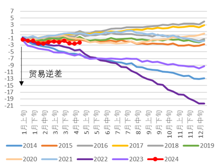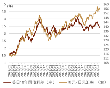 日本的贸易收支实则为边际改善 上周日本公布的4月贸易收支为4625亿日元的逆差,但是我们认为日本的贸易收支实则在边际上出现了明显改善,2024年初以来至4月末,日本的贸易收支为2.2万亿日元的逆差,但是2022年、2023年同期分别为4.4万亿、5.6万亿日元的逆差(图表15)。我们认为今年日元贬值的主要因素并非来自于贸易账户。