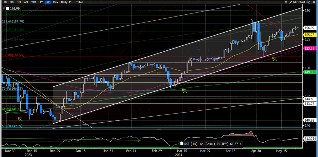 美元/日元上周如期在近期支撑21天均线(图19中黄色线)找到支撑后小幅走高;向前看,5月初高点158附近可能给美元多头提供近期阻力,如果美元多头无法继续向上突破这一关键的近期阻力,那么美元/日元回撤至21天均线的概率则会加大,而如果美元/日元再次跌破21天均线这一近期支撑,那么美元/日元继续走低至年初以来的白色趋势通道下限154附近的概率则会加大。