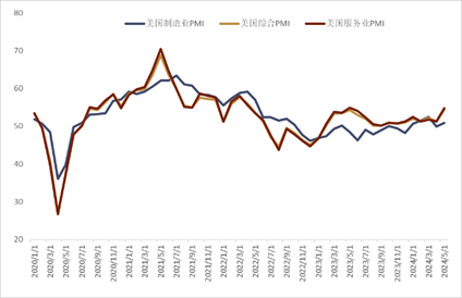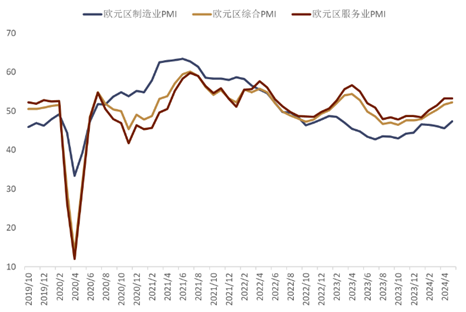 欧元区经济数据继续好转 上周公布的欧元区数据整体继续保持强势。欧元区5月综合PMI初值录得52.3(前值51.7),创下最近一年以来的新高。5月制造业PMI初值录得47.4(前值45.7),也创下最近15个月以来的新高。服务业PMI初值则录得53.3和前值持平(图表7)。而欧元区最大经济体德国的商业活动5月录得连续第二个月的扩张,并且增速有所加快,服务业加速扩张的同时,制造业产出也更接近稳定。德国5月制造业PMI初值录得45.4,高于市场预期的43.5和前值的42.5;服务业PMI初值录得53.9,较前值的53.2小幅上行,高于市场预期的53.5;这也是最近11个月以来的新高;而综合PMI初值录得52.2,大幅高于前值的50.6,而这也是最近1年以来的新高。在此背景下,OIS市场目前虽然依旧预计ECB会在6月开启首次降息,但年内降息总量则下降至60基点左右(图表8)。