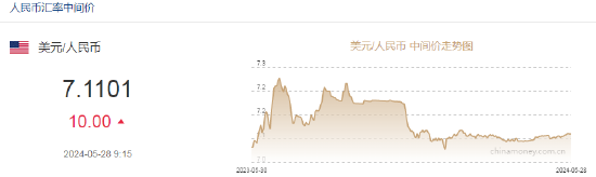 5月28日,人民币中间价报7.1101,下调10点,上一交易日中间价报7.1091。