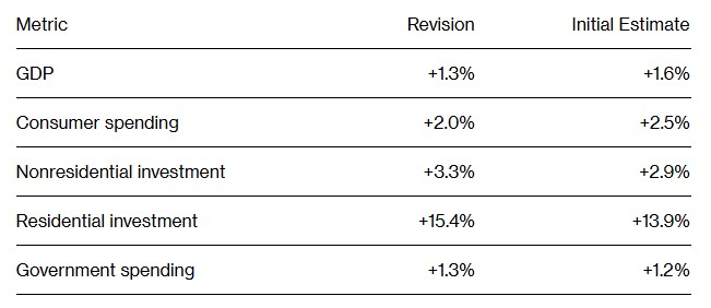 美国第一季度经济增速低于最初公布的水平,反映出消费者支出低于预期。美国经济分析局周四公布的数据显示,美国第一季度实际GDP年化季率修正值为1.3%,低于初值1.6%。美国第一季度消费者支出年化季率修正值为2.0%,低于初值2.5%。