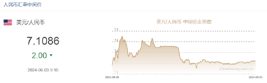 6月3日,人民币中间价报7.1086,上调2点,上一交易日中间价报7.1088。