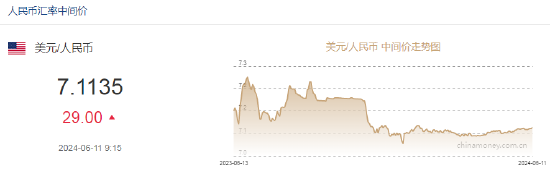 6月11日,人民币中间价报7.1135,下调29点,上一交易日中间价报7.1106。