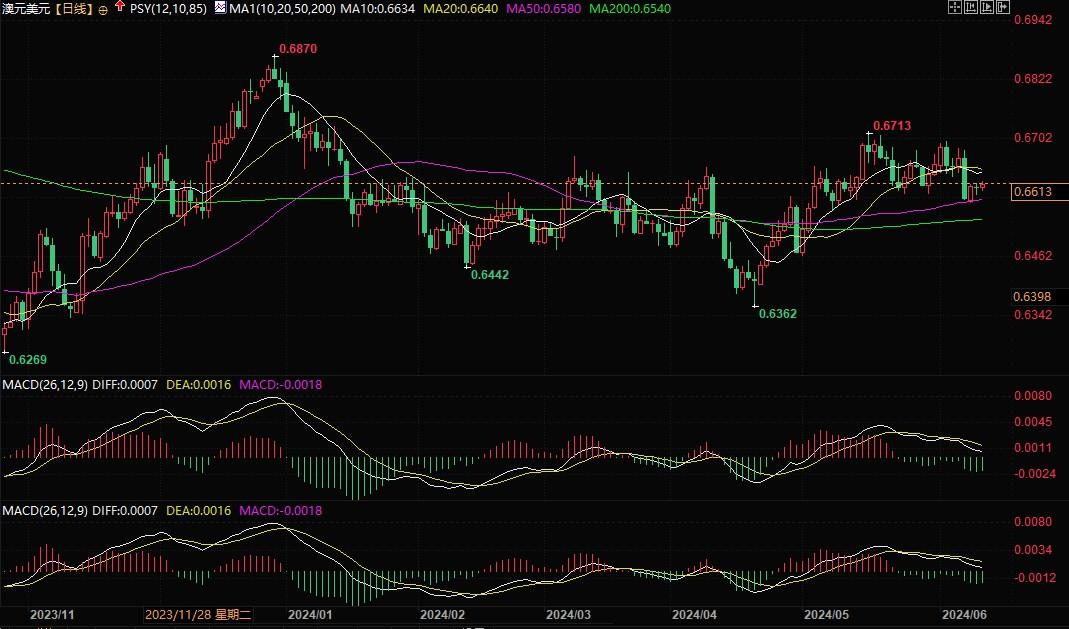 澳元兑美元日线图北京时间6月12日13:20,澳元兑美元报0.6612/13