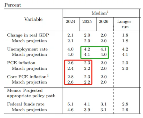 3月与6月点阵图对比2. 经济展望:上调了今年和明年的PCE和核心PCE预期,小幅上调了2025年之后的失业率预期,对GDP预测不变。
