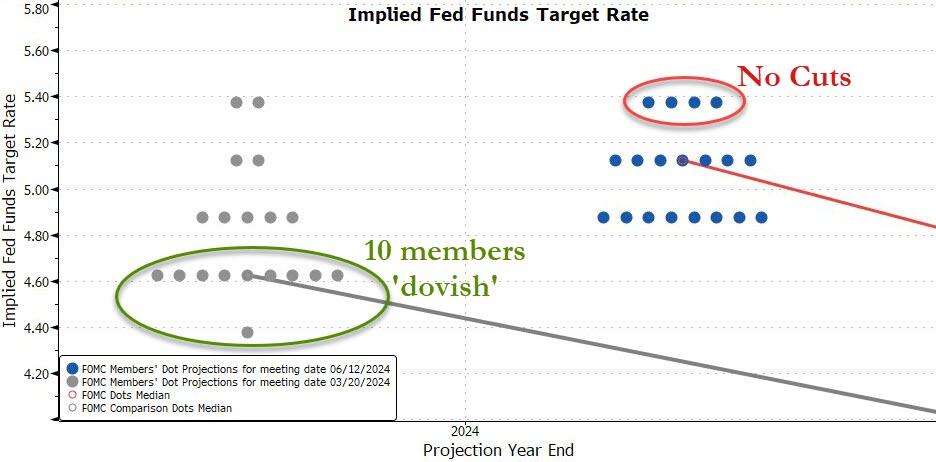 ②这一次出现了多达四位美联储官员支持年内不降息,可以是这一部分美联储内部的极端鹰派力量正在增强。而颇具讽刺的是,三月点阵图中所有支持年内降息三次的10个“点”,这一次一个都没有再保留。