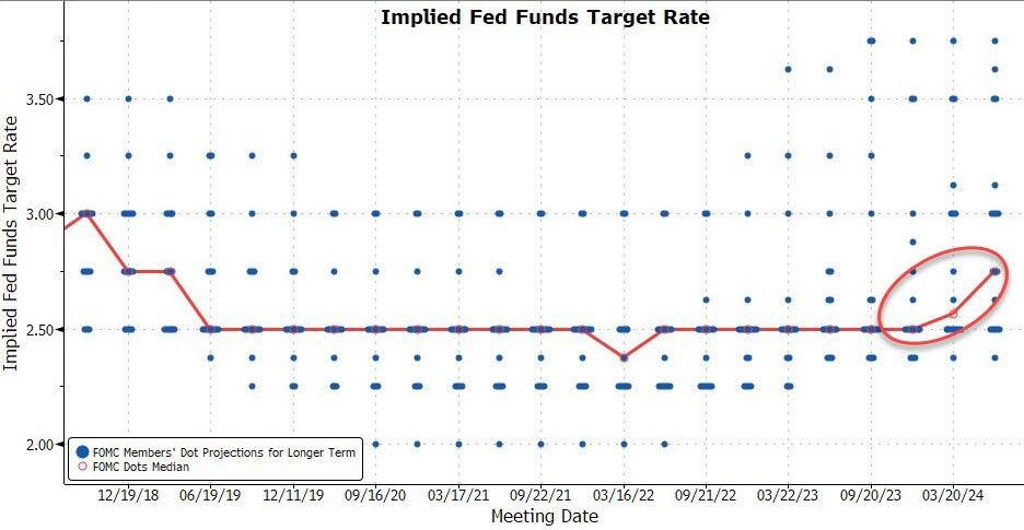 ③随着预期今年降息次数减少,委员们也同步抬高了之后的政策利率路径预期。他们对2025年底政策利率的中位数预期为从3.9%抬高至4.1%,同时将长期政策利率的中位数预期从2.6%提高至2.8%,这也意味着美联储更加认可“中性利率”正在抬高的现实。在过去六个月内,政策制定者已将长期利率预期提高了约25个基点。