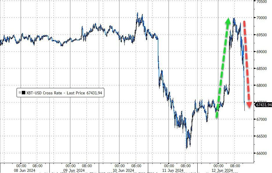 比特币在CPI数据后曾飙升至70000美元,随后则完全回吐了所有涨幅。