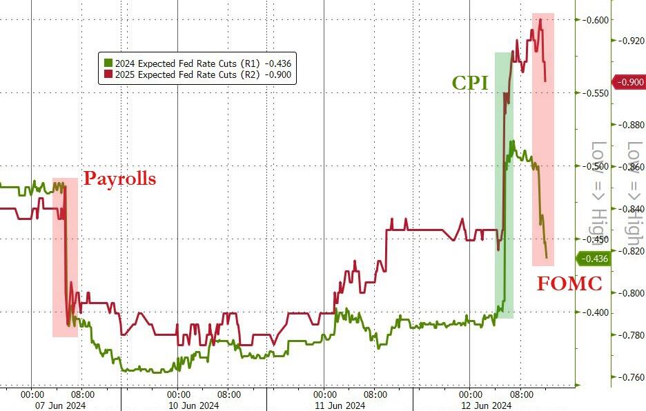 从利率市场的定价看,目前交易员预计美联储在年内有望降息43个基点。这一预期幅度在CPI数据后曾一度超过50个基点(即完全定价两次降息),但在美联储决议发布后,年内是否能两次降息又变成为了一件不那么确定的事。