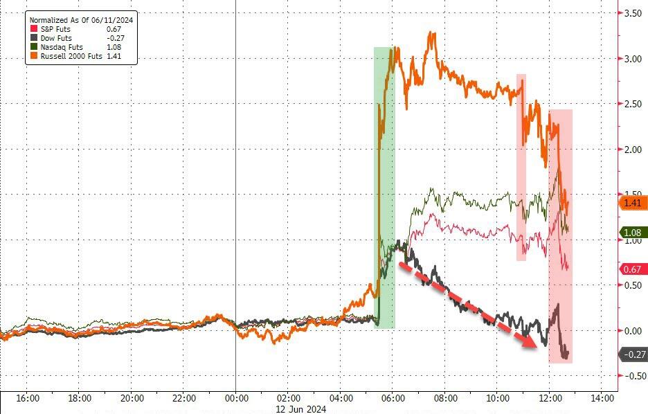 事实上,即便是美国三大股指中,隔夜也并未能全部收涨。随着尾盘回吐涨幅,道指周三最终下跌了35.21点,跌幅为0.09%,报38712.21点。