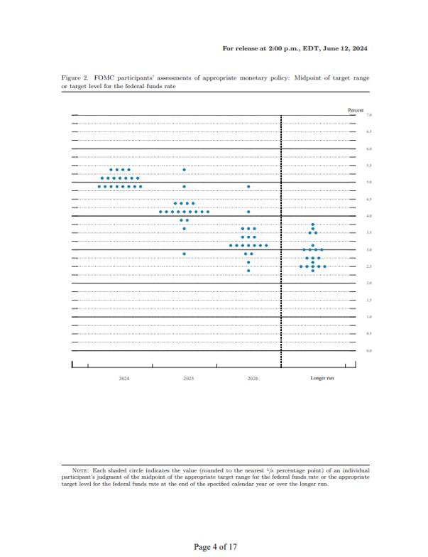 据悉,美联储的点阵图显示,预计2024年将仅降息一次,相比3月份的预测减少了两次。在3月份的预测中,美联储官员一致认为2024年将降息三次。然而,由于第一季度出现了一系列居高不下的通胀数据以及美联储官员发表的谨慎言论,这一预测受到了质疑。