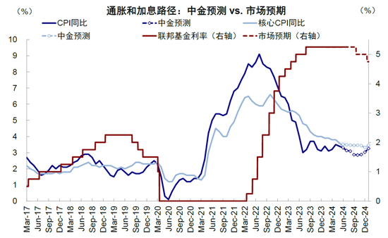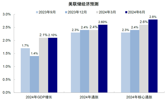 相比3月会议的预期,“点阵图”将年内降息下调至1次,比市场预期的略显鹰派。相应的,将2025年降息次数从此前的3次上调至4次,使得整体降息次数从6次减少至5次。此外,此次会议也上调了中长期利率中枢(r*),从此前的2.6%上调至2.8%,一定意义上体现美联储可能认为利率比想象的维持在高位更长时间。此外,本次会议美联储上调了PCE的预测,算是对过去一个季度经济变化情况的追认和修正。