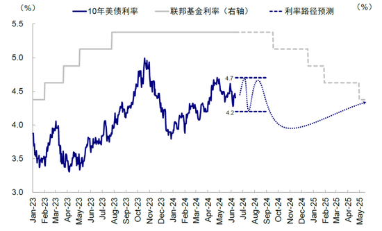 此次会议传递的几点信息基本符合我们的预期:1)降息仍有可能,只有通过这种方式避免让市场提前过于兴奋,让现在偏紧的金融条件维持这种状态,才能为未来政策操作留下空间;2)三季度是关键窗口。5月核心CPI继4月后再度超预期放缓至0.2%,我们预测三季度CPI将继续回落至3%以下,对应PCE回落至2.5%附近,给政策操作提供空间。而年底通胀翘尾和大选因素,都会增加美联储的操作难度。3)整体降息幅度100~125bp。此次点阵图给出的降息幅度为125bp,和我们在(《全球市场2024下半年展望:宽松已过半场》)中的测算一直,降息100bp左右足以解决经济和金融风险。我们测算,长债利率在4%左右是合适水平;考虑利差压力和金融风险,美联储可能仅共需要降息100~125bp左右,从5.3%降至4.3%附近。