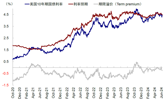图表:假设r*在1-1.5%,通胀预期2.5%,期限溢价0-50bp附近,美债中枢4%左右