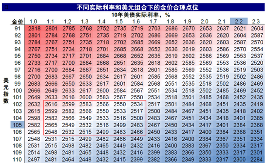 图表:假设实际利率1~1.5%,美元102~106,黄金合理中枢为2500美元/盎司