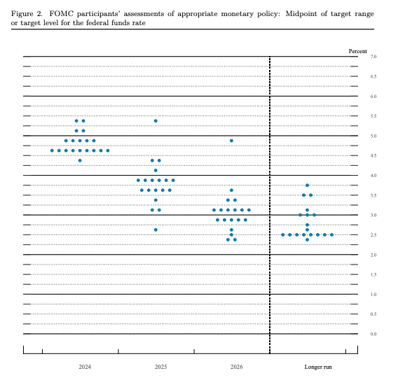 点阵图显示了美联储官员对联邦基金利率的估计值。参与制定利率的FOMC成员各自为未来三年的年底以及长期利率的预测分配一个点。多达19名货币政策制定者——美联储理事会的7名理事和12家地区联储的主席各自都可以贡献一点,投资者最关注的是中点。