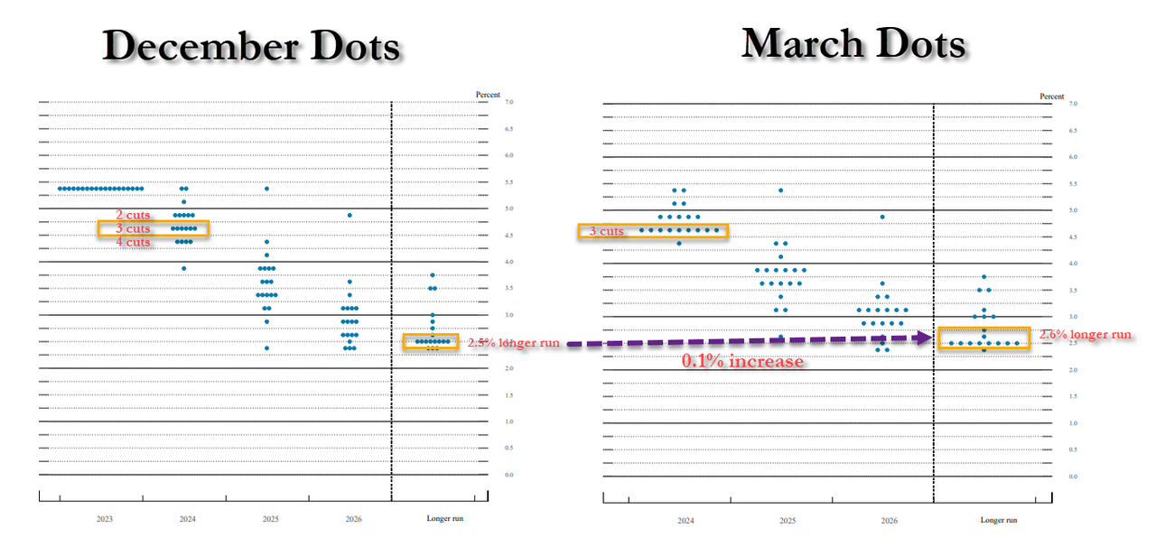 在3月的点阵图中,美联储对2025和2026年的政策利率中位数预期为3.9%和3.1%,对长期利率的预测中值从2.5%提高到了2.6%。