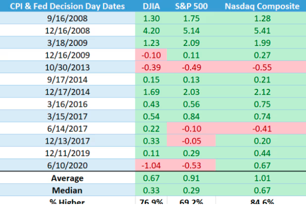 目前一组颇有意思的历史统计是,虽然美联储议息日“邂逅“CPI发布日的情况样本量很小,但根据道琼斯市场数据,美股三大股指在这些日子里往往都会上涨——在这13次里,标普500指数平均上涨0.7%,道指平均上涨0.9%,纳斯达克综合指数平均上涨超过1%。