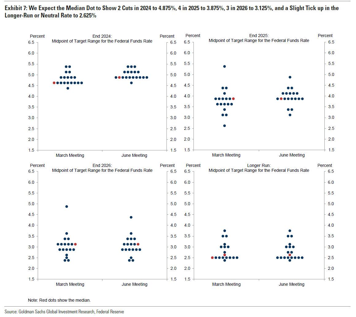 下图是高盛对于今晚点阵图变动的预估。整体来看,高盛与多数华尔街人士一样,预计6月点阵图中值将显示2024年降息两次至4.875%(3月份点阵图为降息三次),2025年降息四次至3.875%(3月点阵图为降息三次,但其实两年的总降息幅度不变),2026年将降息三次至3.125%(保持不变)。