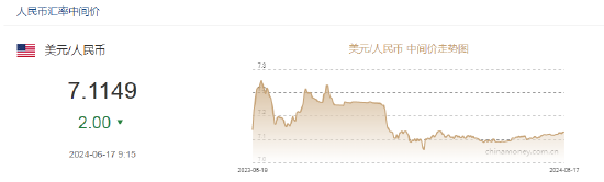 6月17日,人民币中间价报7.1149,上调2点,上一交易日中间价报7.1151。