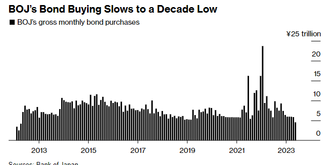 减少债券购买的举措是日本央行行长植田和男决心在执行十多年的大规模刺激政策之后,逐步实现政策正常化的最新迹象,但这一行动延迟表明日本央行仍持谨慎态度。自今年3月正式放弃收益率曲线控制政策以来,植田已表示购买债券不再是日本央行的货币政策工具。