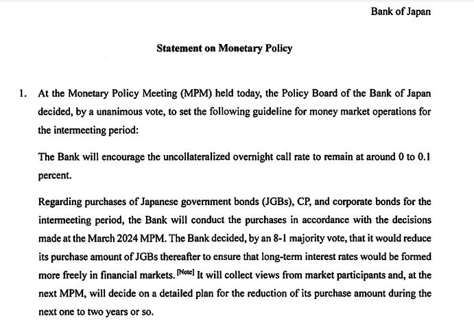 根据声明,有关购买日债的决定以8比1的投票结果获得通过,委员中村豊明持不同意见。他认为应该在2024年7月的展望报告中重新评估经济活动和通胀进展后,再决定减少购买。但他赞成减少购债数量的想法。