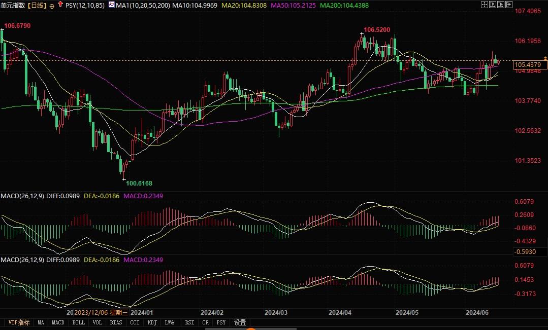 美元指数日线图北京时间6月18日13:42,美元指数报105.43